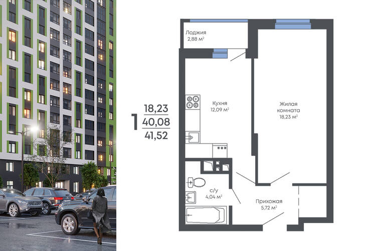 1-комнатная квартира, 41.52 м² №625