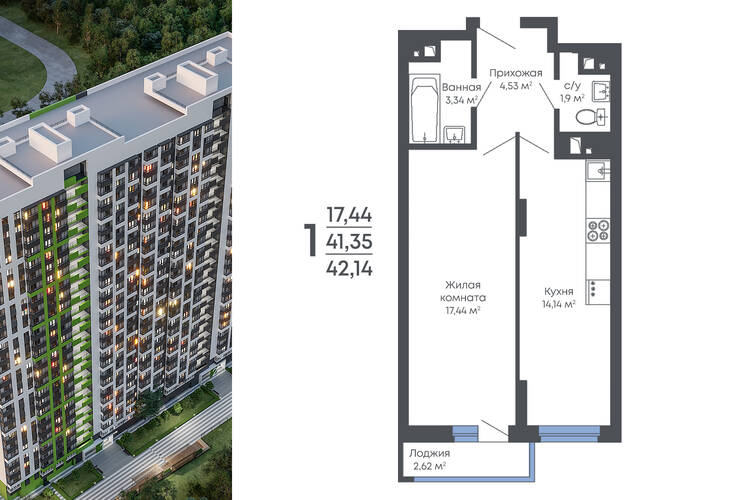 1-комнатная квартира, 42.14 м² №418