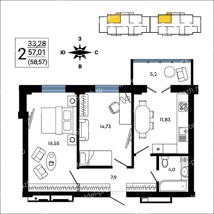 2-комнатная квартира, 58.57 м² №182